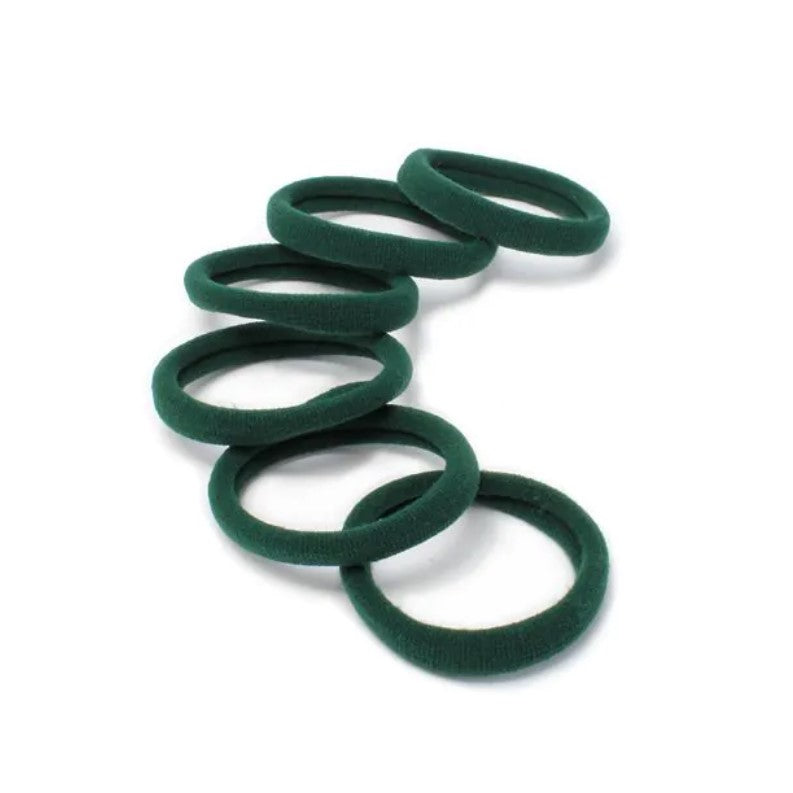Card of 6 soft Bottle Green jersey fabric snag free endless elastics. 5cm diameter 1cm thick.