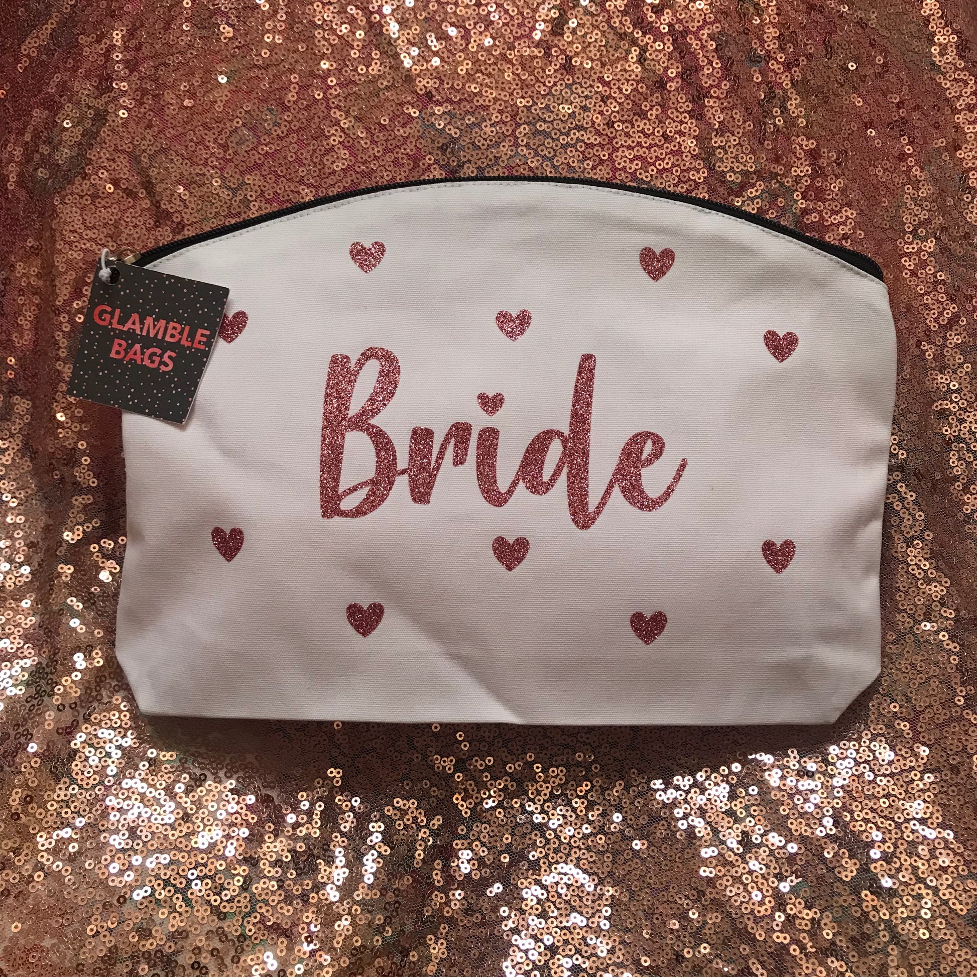 This Glamble Bag is made from white canvas, has a black zip, Rose Gold Glitter vinyl lettering and heart details. Each bag measures approximately 24 x 20cm.