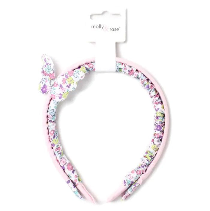 Fabric covered alice bands in Pink and Blue. Each alice band set comes with 1 floral print alice band and 1 plain fabric alice band with floral print butterfly motif.