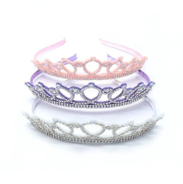Felt crown/tiara on a satin covered aliceband with diamante embellishment. Available in Pink, Lilac and White.