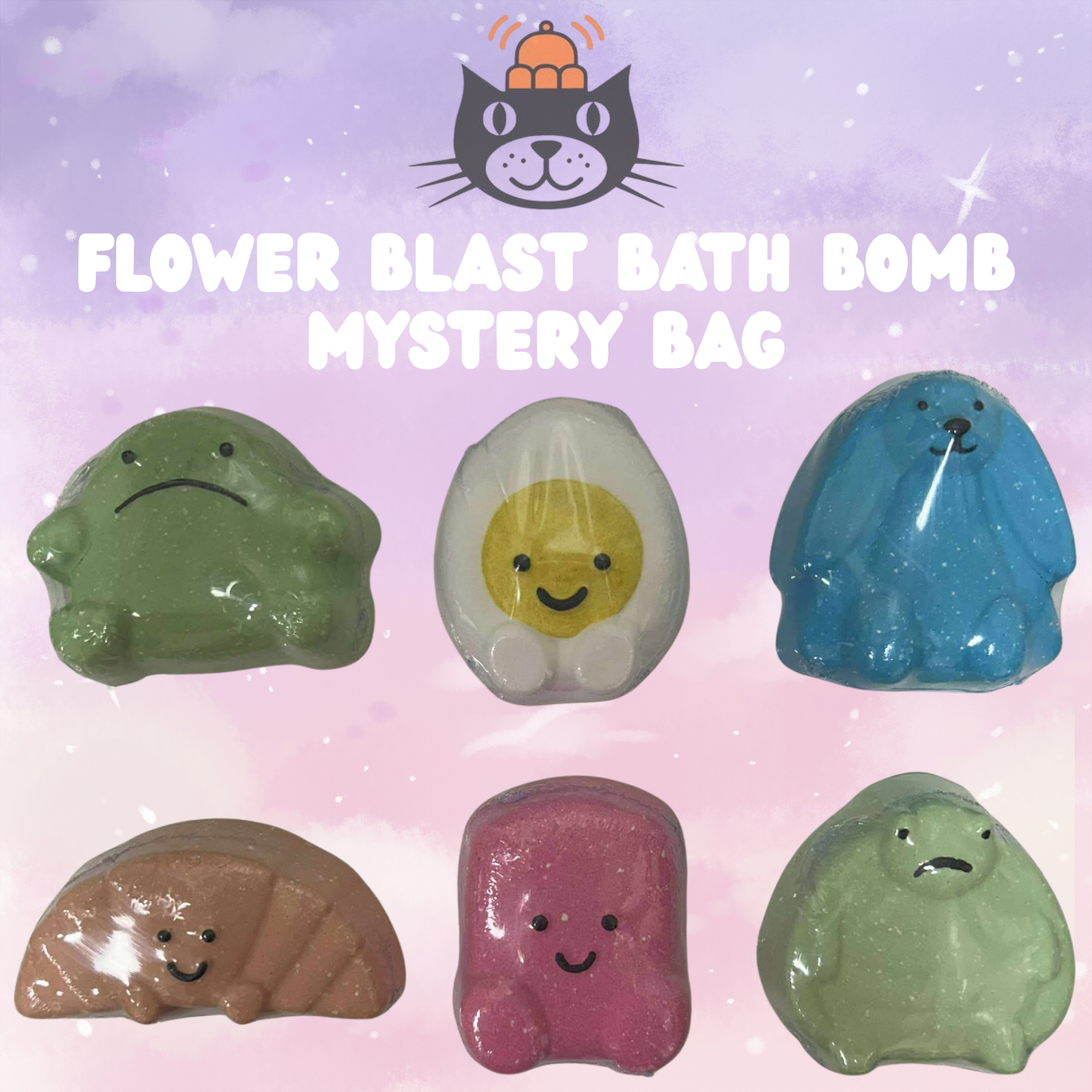 Flower Blast fragranced mystery bag Bath Bomb. 6 different bath bombs available Frog, Turtle, Egg, Marshmallow, Croissant and Bunny. One Bath Bomb per mystery bag.